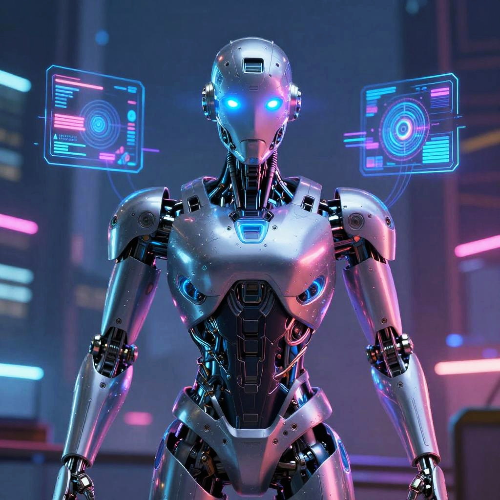 Ai character image generator creating a futuristic humanoid robot with glowing blue eyes and sleek metallic armor, surrounded by digital holograms and neon light effects, in a cyberpunk cityscape backdrop, ultra-detailed and vibrant colors
