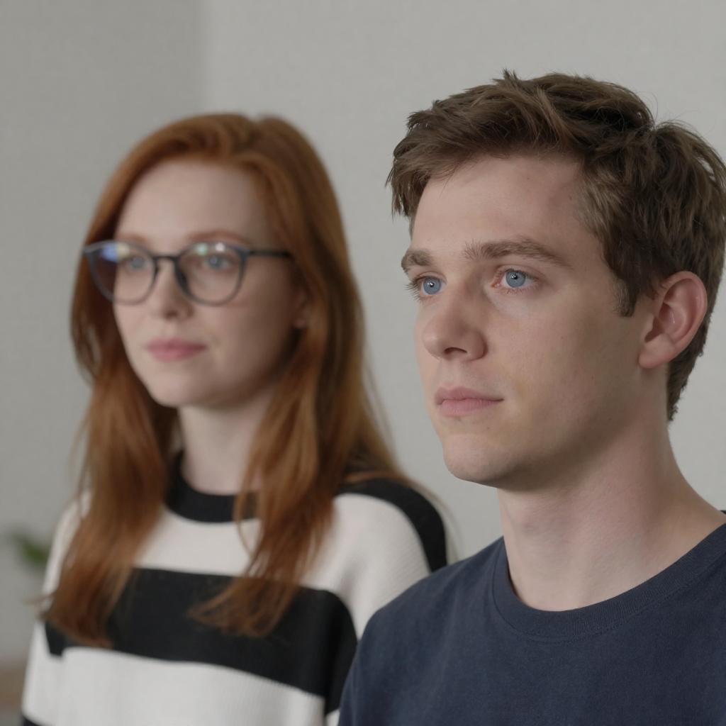 Two men sitting on a brown, furry blanket-covered couch. The man on the left has short red hair, wears a black shirt and ripped jeans, with a neutral expression. The man on the right has short blonde hair, wears a purple tank top and green pants, with a slightly scowling expression. Both have arms crossed, legs apart. The background is a plain, ured wall.