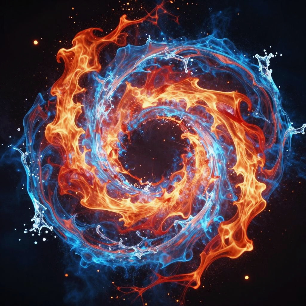 Wгјtende visualized as a powerful elemental force, a swirling vortex of fire and water intertwined, dynamic motion captured with vivid reds and blues, high contrast with sparks and splashes frozen in intense energy