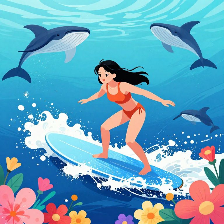 A vibrant anime-style illustration depicts a beautiful girl surfing on a wave, surrounded by manta rays and whales in the ocean, with bright, colorful flowers adorning the scene.