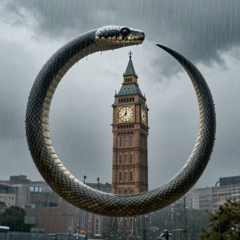 Photograph of a large, realistic, black snake coiled in a circular shape in front of the iconic Big Ben clock tower in London. The snake's scales are detailed and shiny, with its head raised and eyes alert. Rain is falling, creating a blurred, misty effect in the background. Big Ben's clock face is illuminated, and the sky is overcast. Buildings in the background are slightly blurred, emphasizing the snake and clock tower. The overall color palette includes dark greys, blacks, and the warm brown of Big Ben. The image has a dramatic, surreal quality.