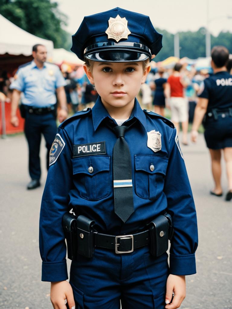 Child in Police Officer Costume, festival cosplay photo, photorealistic realism