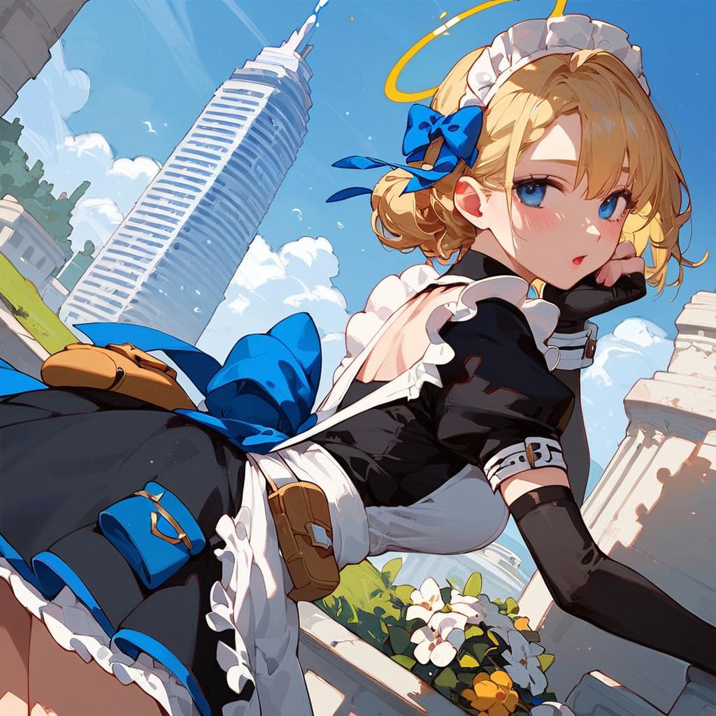 Score_9, score_8_up, score_7_up, source_anime, tokiasuma, blonde hair, blue eyes, hair bun, short hair, halo, apron, belt pouch, black dress, black gloves, blue bow, bow, dress, elbow gloves, fingerless gloves, gloves, long sleeves, maid, maid apron, maid headdress, pouch, outdoors, cityscape, bent over, looking at viewer, dutch angle, cowboy shot