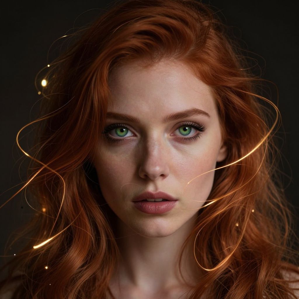 Photorealistic portrait of a fair-skinned, red-haired woman with striking green eyes, glowing light trails, and a dark background.