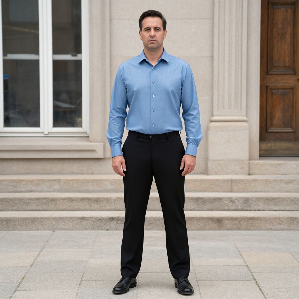 "Working Man Costume, man in a blue shirt and black pants standing in front of a building"