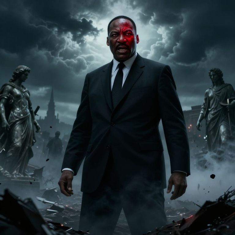 Evil MLK in a surreal nightmare scene, half his face shadowed with glowing red markings, standing amidst a battlefield of shattered statues, dark storm clouds and eerie fog, expression filled with rage and determination