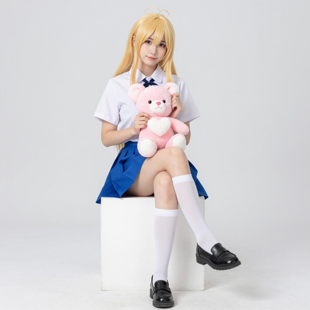 Blonde Cosplayer in Black Outfit with Green Eyes