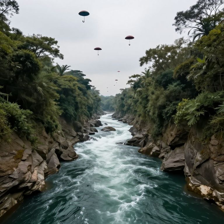 Photograph of a turbulent river flowing through a dense, green jungle canyon with rocky cliffs, under a cloudy sky. Paragliders float above,