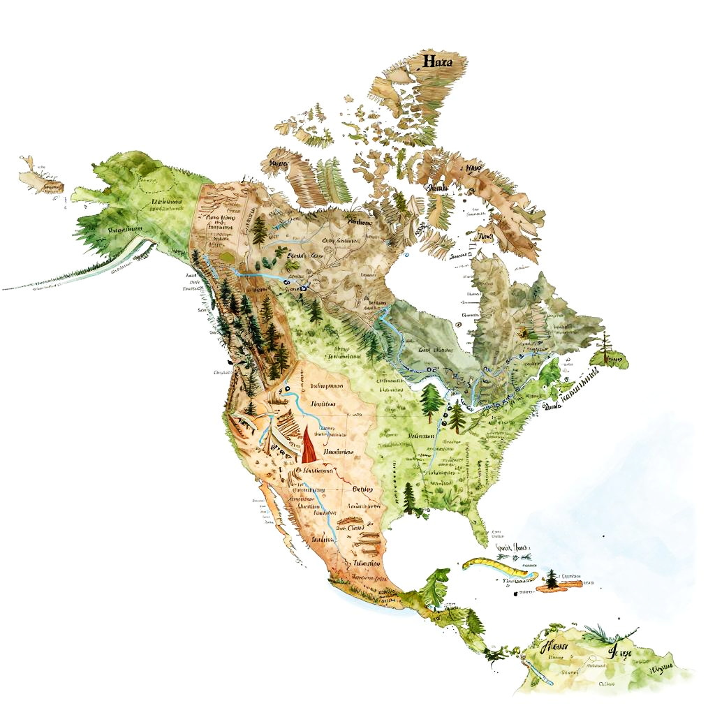 Artistic North America map labeled with indigenous territories, natural landmarks, rivers and cities, hand-drawn style with watercolor textures, soft pastel colors, elegant script labels