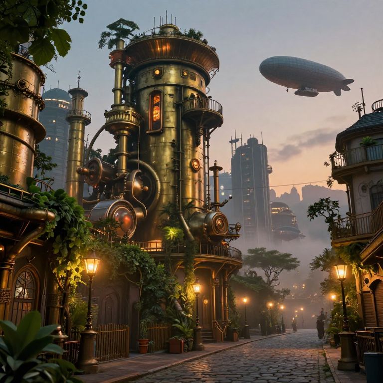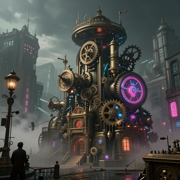 Anacronism in a steampunk cityscape, intricate Victorian machinery clashing with futuristic neon technology, blending old-world charm and cyberpunk aesthetics, atmospheric fog and glowing gears, surreal fusion style.