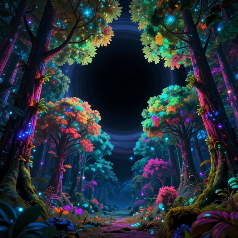 In the realm of surreal digital art, envision an extraordinary landscape where a vivid, neon-drenched forest converges with the brink of an enigmatic black hole. Majestic trees, their glowing leaves emitting a kaleidoscope of hues, stand at the precipice overlooking the vast chasm. This cosmic vantage point reveals a peculiar fusion: the serene splendor of nature harmonizing with the immense gravitational force of space-time. The panoramic scene should instill both fascination and reverence for the magnificence of this surreal cosmos, beckoning viewers to ponder the secrets concealed within its depths.