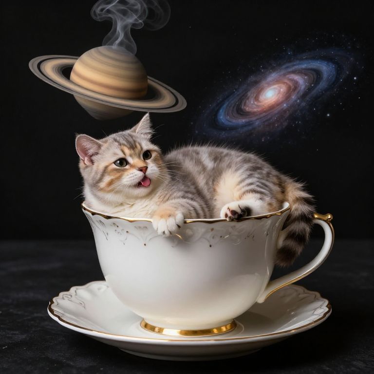 A nebula-shaped cat lounges indifferently atop a giant teacup, sipping a gravy-steam from a saucer that floats above Saturn.