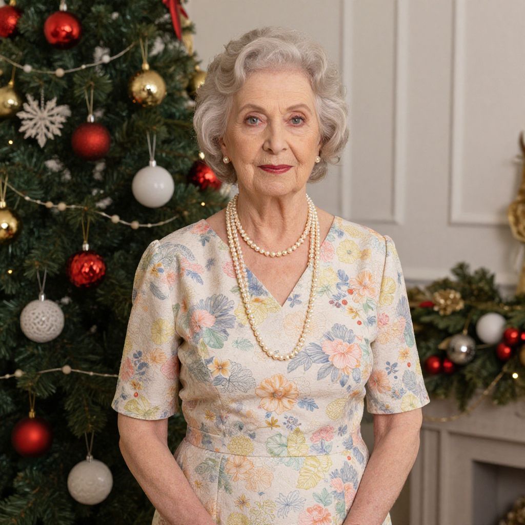 Photograph of an elderly white woman with short curly white hair, glasses, and a beige sweater, sitting in an ornate armchair in front of