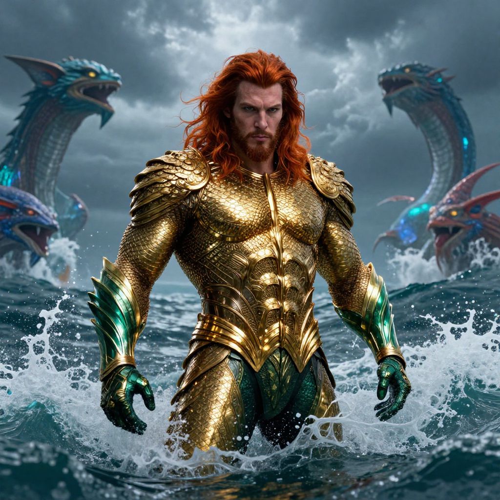 Aquaman with vibrant red hair emerging from the ocean, clad in intricate golden armor, powerful and majestic, surrounded by swirling waves and mythical sea creatures under a stormy sky, cinematic lighting, detailed fantasy art style.