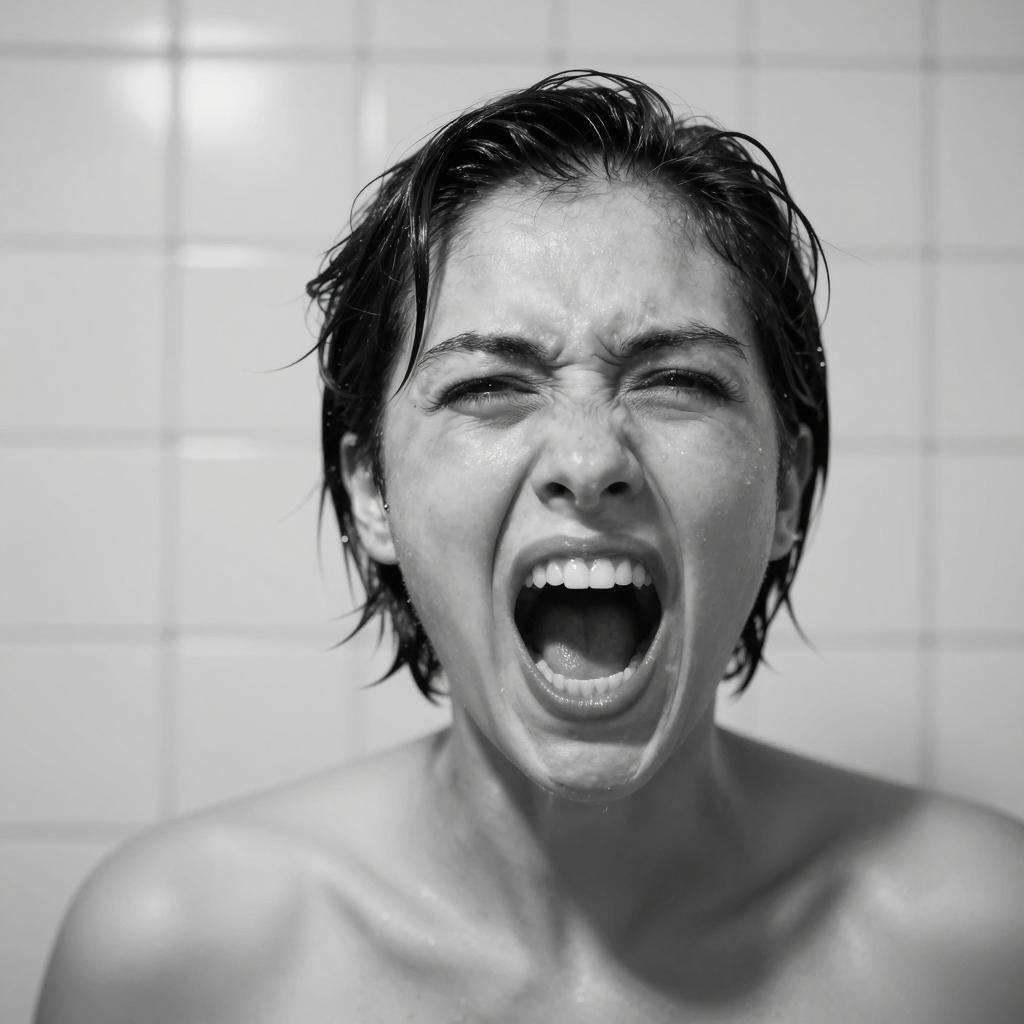 Black-and-white photograph of a woman with curly hair, wide eyes, and open mouth screaming. Her face is close to the camera, occupying the center. She has a pale complexion and visible teeth. The background is dark and out of focus. Her expression is intense and emotional. She is wearing a sleeveless top. The lighting highlights her face and hair.