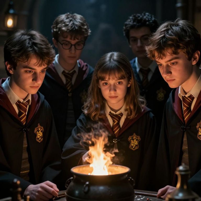 Photograph of four Hogwarts students, three boys and one girl, in dark robes with striped ties, gathered around a lit cauldron in a dim