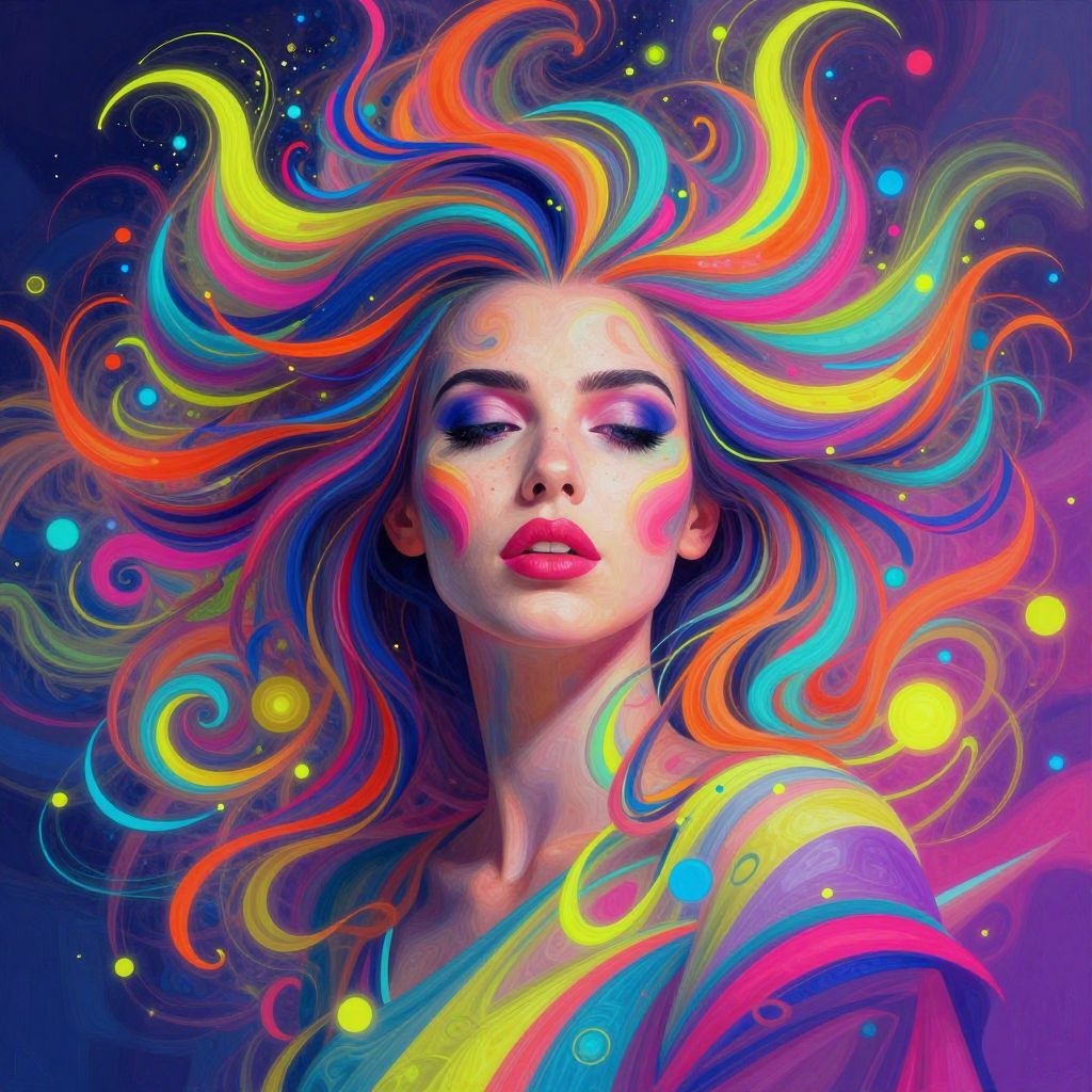 A vibrant, abstract portrait of a woman with flowing hair, adorned with swirling patterns and neon colors, evoking a dreamlike, musical atmosphere.