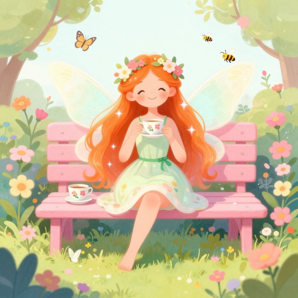 Whimsical pastel illustration of a joyful fairy with long orange hair, delicate butterfly wings, and a flower crown, sitting barefoot on a charming pink garden bench. She is holding sparkling floral teacups, surrounded by blooming flowers, butterflies, and bees in a vibrant garden setting.