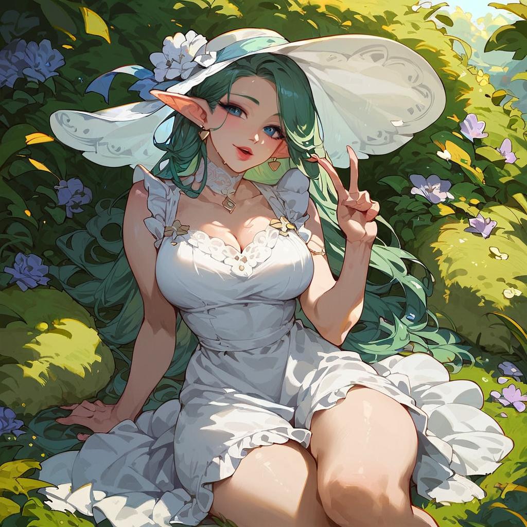 Score_9, score_8_up, score_7_up, rating_safe, beautiful elf woman smiling, v, head tilt, sundress, thick thighs, dark green hair, hat, light purple eyes
