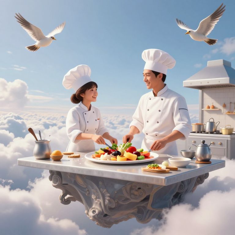 Photorealistic digital artwork depicting two Asian chefs, a man and woman, in white chef hats and double-breasted jackets, cooking on an ornate floating marble table amidst fluffy clouds. They are preparing a colorful plate of vegetables and fruits. Two white doves fly above them. The background includes a white kitchen with an oven and utensils. The bright blue sky and sunlit clouds create a whimsical, dreamlike atmosphere. The chefs are smiling, engaged, and focused on their culinary task.