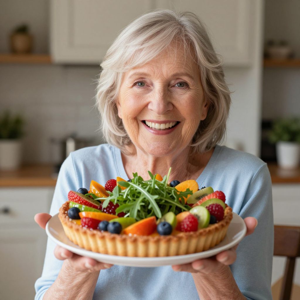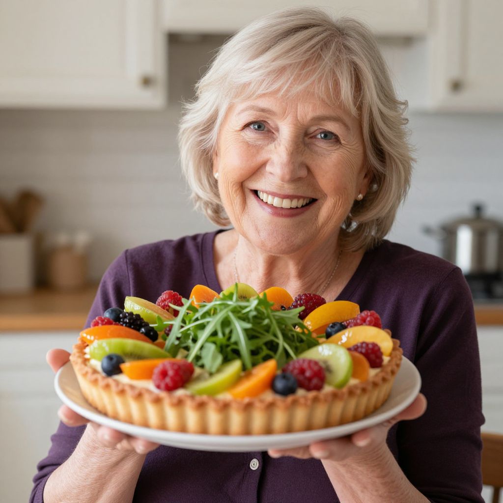 Smiling elderly woman proudly presenting a vibrant fruit tart topped with fresh arugula, showcasing a joyful embrace of healthy eating after 60.