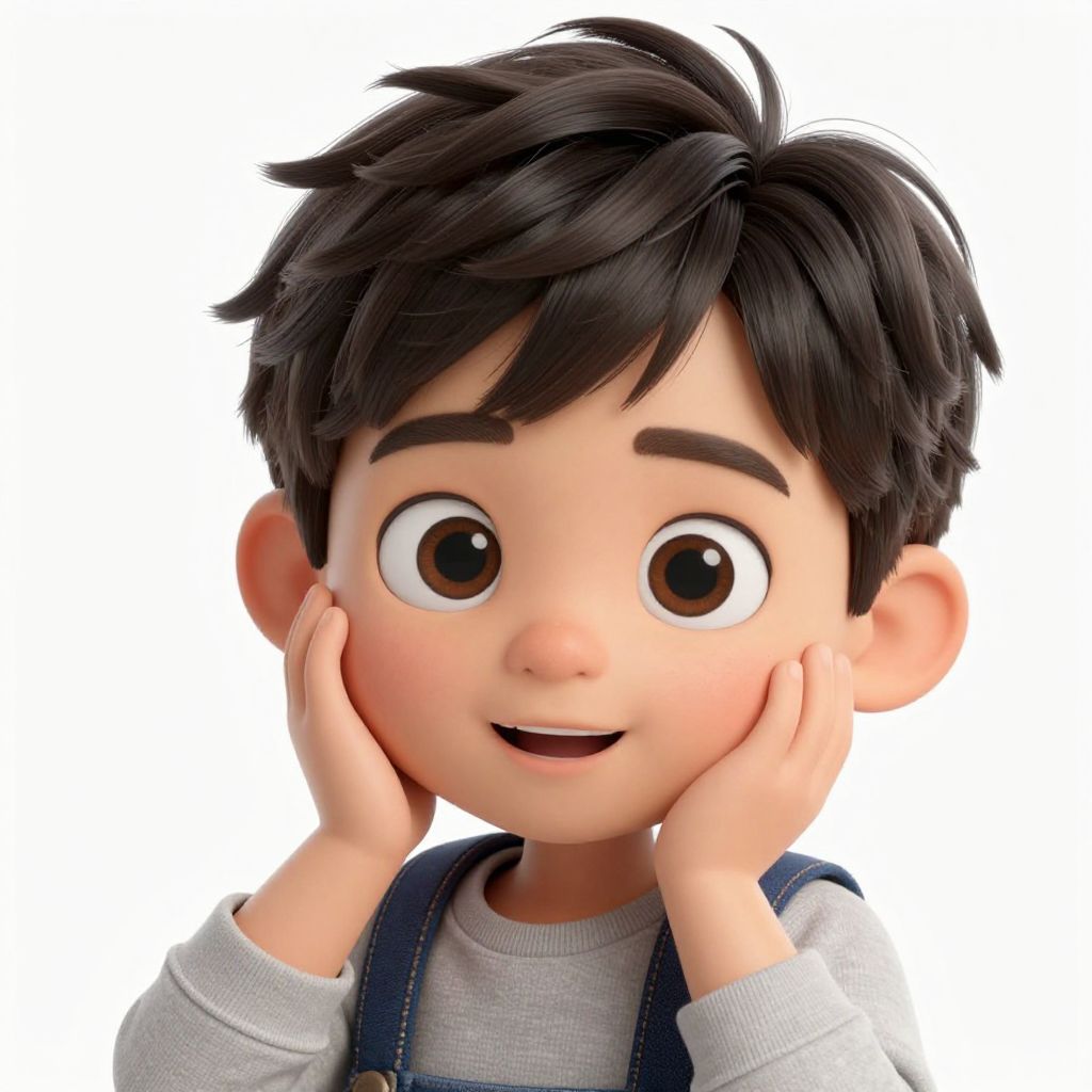 A vibrant CGI image featuring three animated, cartoon-style boys with large, expressive eyes and exaggerated features. The central boy, with black spiky hair, a green shirt, gray shorts, and black sneakers, is in an energetic fighting stance with one arm raised and a smile. Two smaller boys with similar appearances and outfits are in the background, mimicking his pose. The setting is a colorful, blurred outdoor environment with purple and blue hues, and indistinct greenery. The boys' skin is light, and the image has a playful, dynamic feel, emphasizing action and fun.