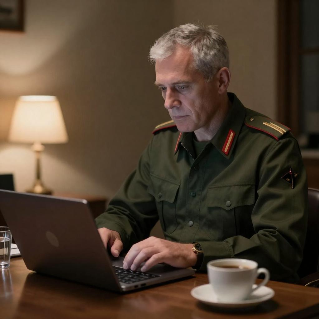 Photograph of an older white man with gray hair, wearing a dark green military uniform with red shoulder epaulettes, sitting at a wooden desk. He is focused on a laptop, with a lit table lamp, glass, and cup in the background. Warm, dim lighting creates a serious atmosphere.