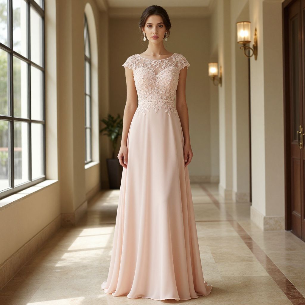 Elegant woman standing gracefully in a long lace bridesmaid dress featuring a light blush pink hue, with intricate floral detailing on the bodice and flowing chiffon skirt, set against the backdrop of a grand hallway illuminated by natural light streaming through tall windows and complemented by ornate wall sconces.