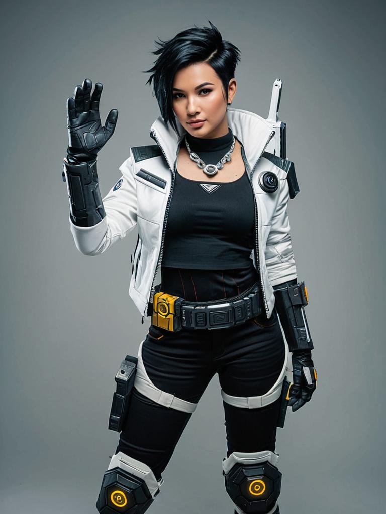 Photo-realistic cosplay photo of person in crypto (apex legends) costume. Full body. Standing. Full length. 1boy, black eyes, black hair, parted hair, white jacket, black shirt, black gloves, necklace, undercut