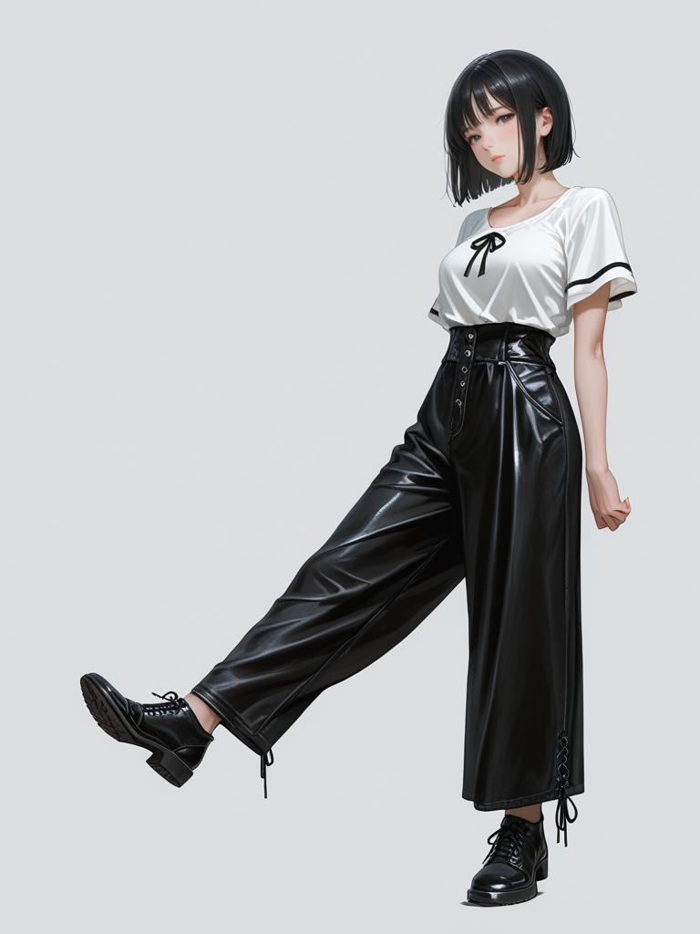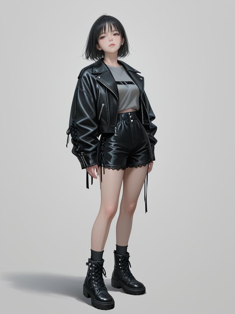 1girl, realistic face, full body shot, Woman, contemporary casual, black halter neck crop top, sleeveless, backless, paired with high-waisted shorts with vertical black and white stripes, loose fit, mid-thigh length, holding a black shoulder tote bag, white background.