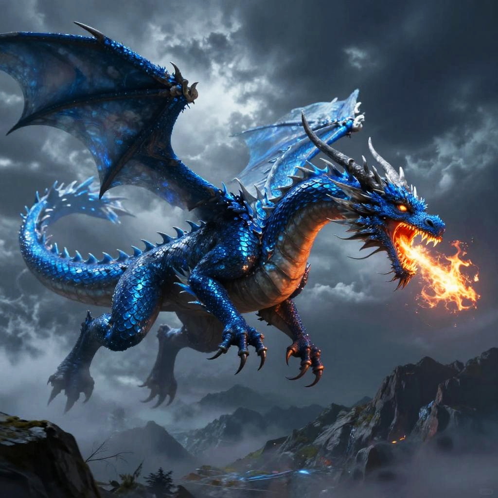 Dragon blue fire blazing from its mouth, soaring over a dark mountain range under a stormy sky, intricate scales shimmering with icy blue hues, dynamic fantasy art style