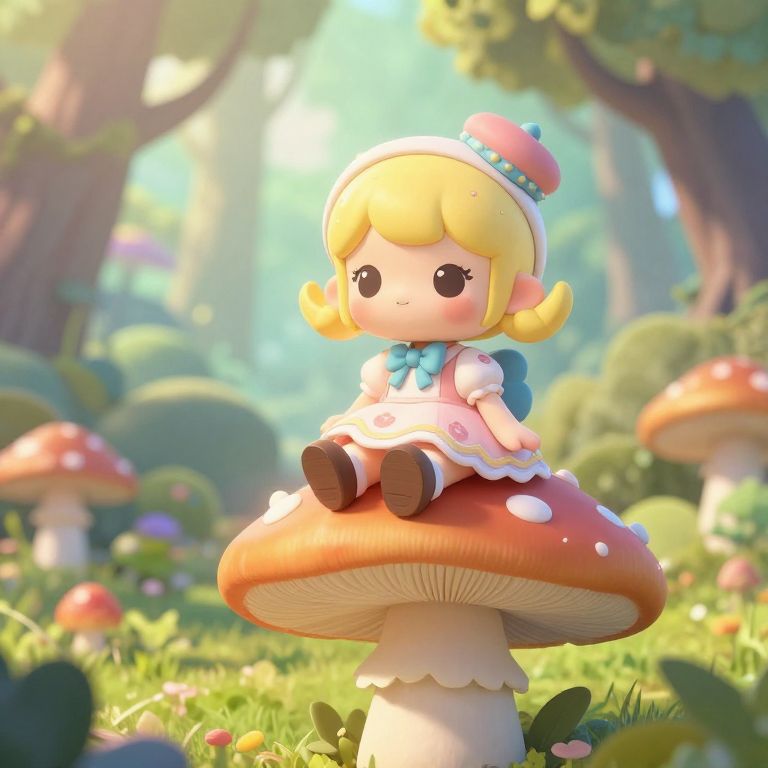 Toadette sitting on a large mushroom in a mystical woodland, bright pastel palette, intricate details on outfit and surroundings, soft sunlight filtering through leaves, enchanting and playful mood, high resolution fantasy art