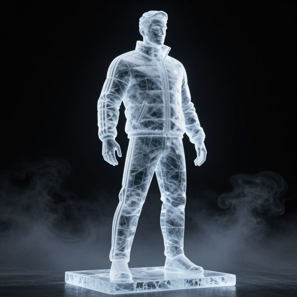 Transparent ice sculpture of man in adidas winter jacket sportswear, intricate sculpture, godlike, low poly, octane render, 4k, volumetric lighting, fog, black background