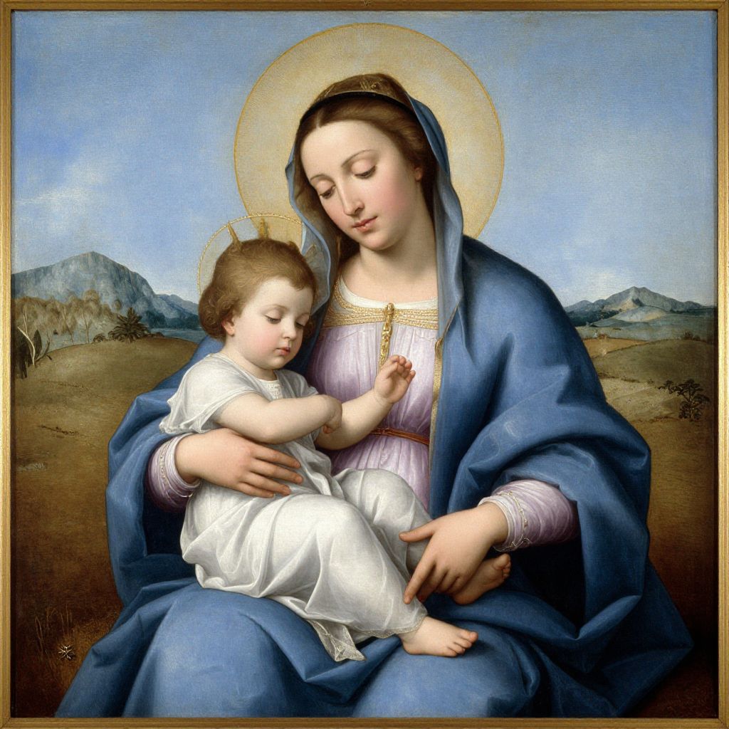 Renaissance-style painting of the Virgin Mary in blue cloak, holding the Christ Child in white garments, both with golden halos, set against a