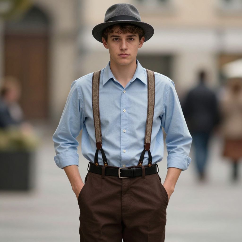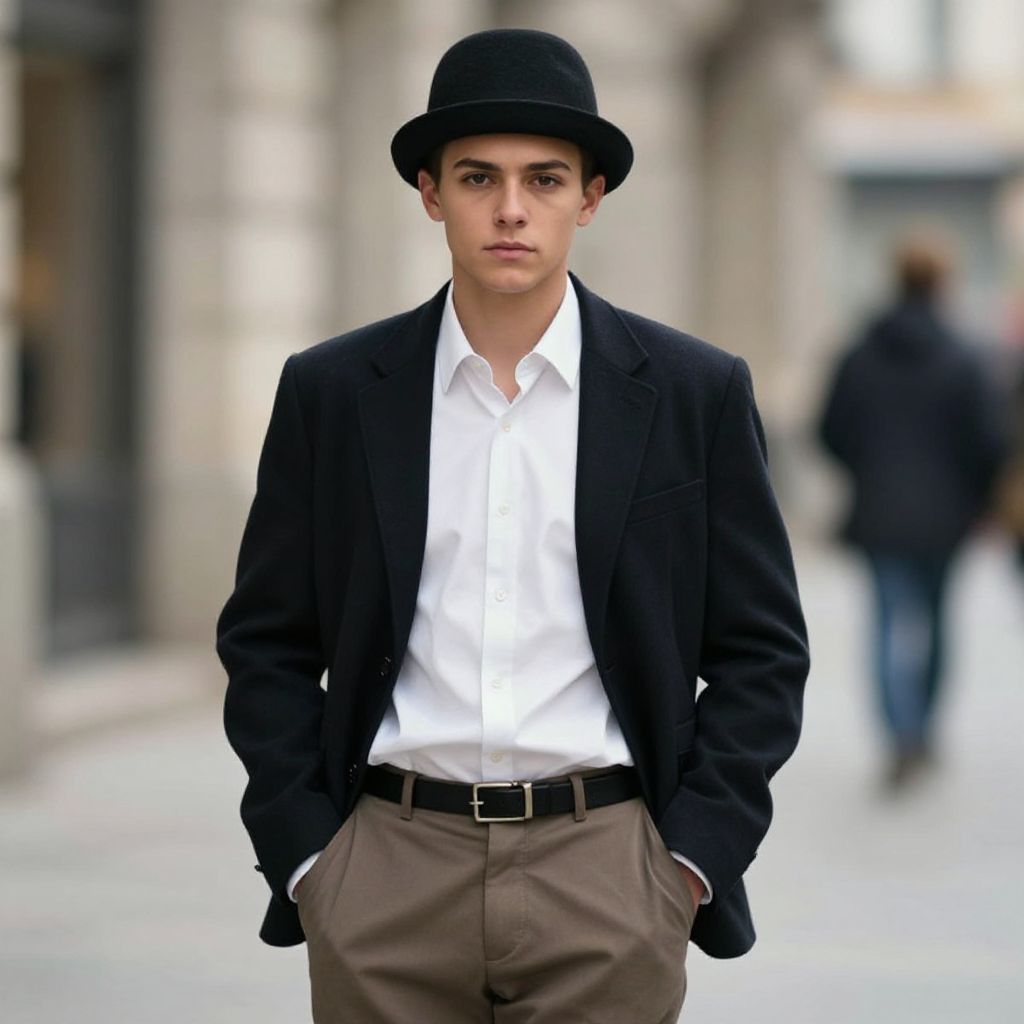 "great gatsby party costume, hat, necktie, male focus, hands in pockets, fedora, multiple boys, vest, pants, blurry, street, shirt, formal, outdoors, blurry background, suit, 1boy, white shirt, full body Realistic photo of casual sexy person with pretty face"