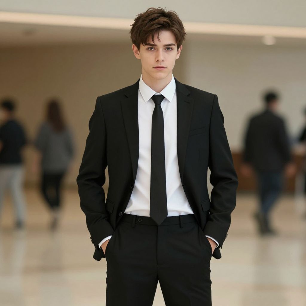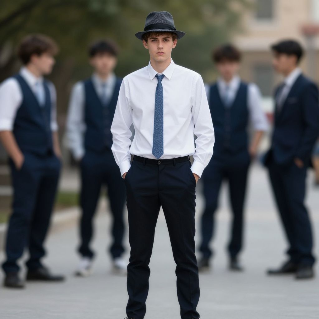 Photograph of a young Caucasian male, standing center-front in a formal attire. He wears a white dress shirt, dark blue tie with subtle pattern, black trousers, and a black bowler hat. His hands are in his pockets, and he has a neutral expression. In the blurred background, four other young males, also dressed in white shirts, dark vests, and black trousers, stand in a loose formation. The scene takes place outdoors on a paved pathway, with greenery and a building visible in the distance. The overall style is formal and slightly vintage.