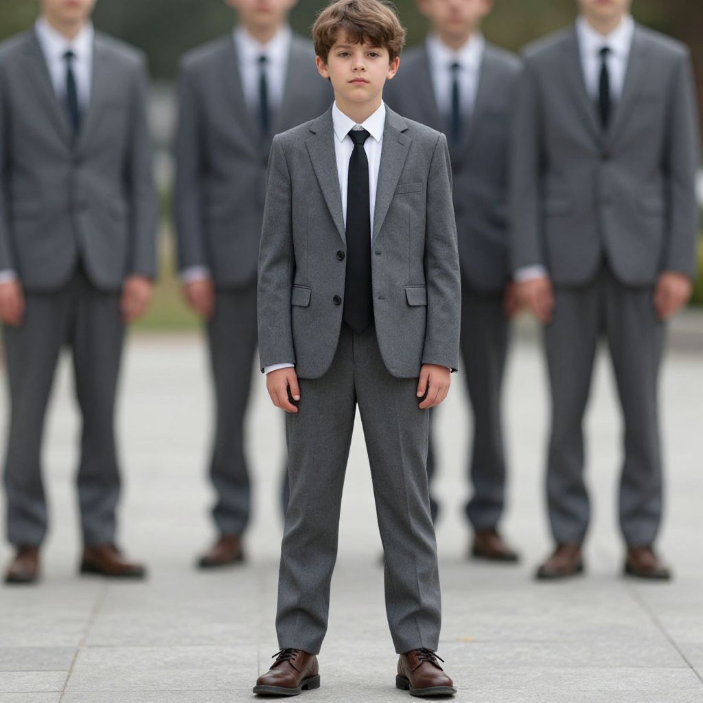 Photograph of a young boy in white shirt, blue tie, black pants, and black bowler hat, standing confidently in front of five blurred,