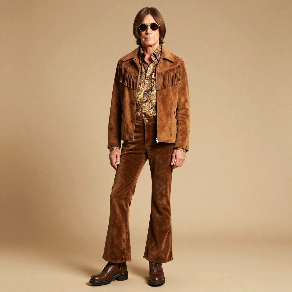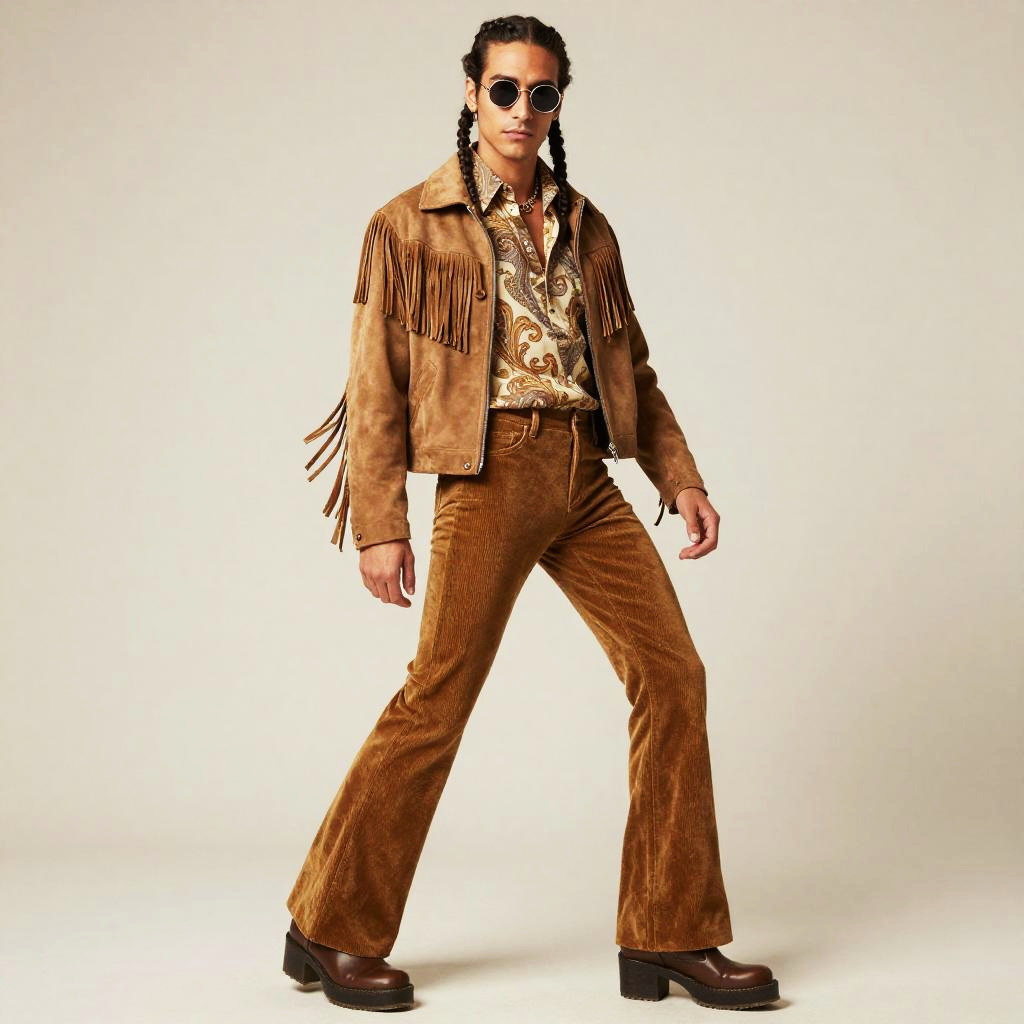 Young woman, boho waves, lean build, 70s theme outfit, retro 70s style, tie-front blouse, crochet vest, wide-leg trousers, funky platform shoes, peace symbol necklace, hippie