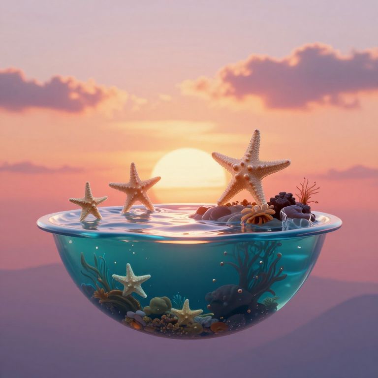A surreal 3D-rendered scene depicts an inverted ocean basin floating against a vibrant sunset backdrop, where starfish with translucent bodies explore a miniature underwater world, creating a dreamlike illusion of the sky as an alien sea.