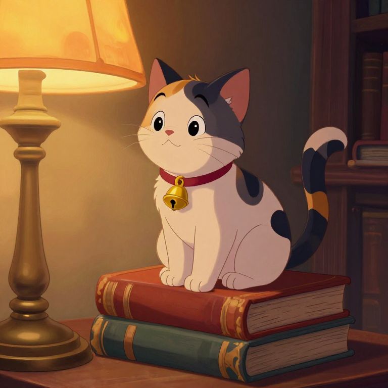 A fluffy Disney calico cat lounging lazily on a cozy windowsill, with warm sunlight streaming through lace curtains, rendered in a soft painterly style that highlights the cat's tri-colored fur and friendly, curious expression, evoking a nostalgic animated fantasy.