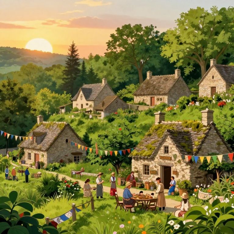 Verdoro village nestled in lush greenery, quaint stone cottages with mossy roofs, villagers in rustic clothes gathering for a festival, colorful banners and lanterns hung between trees, warm sunset light, storybook illustration style