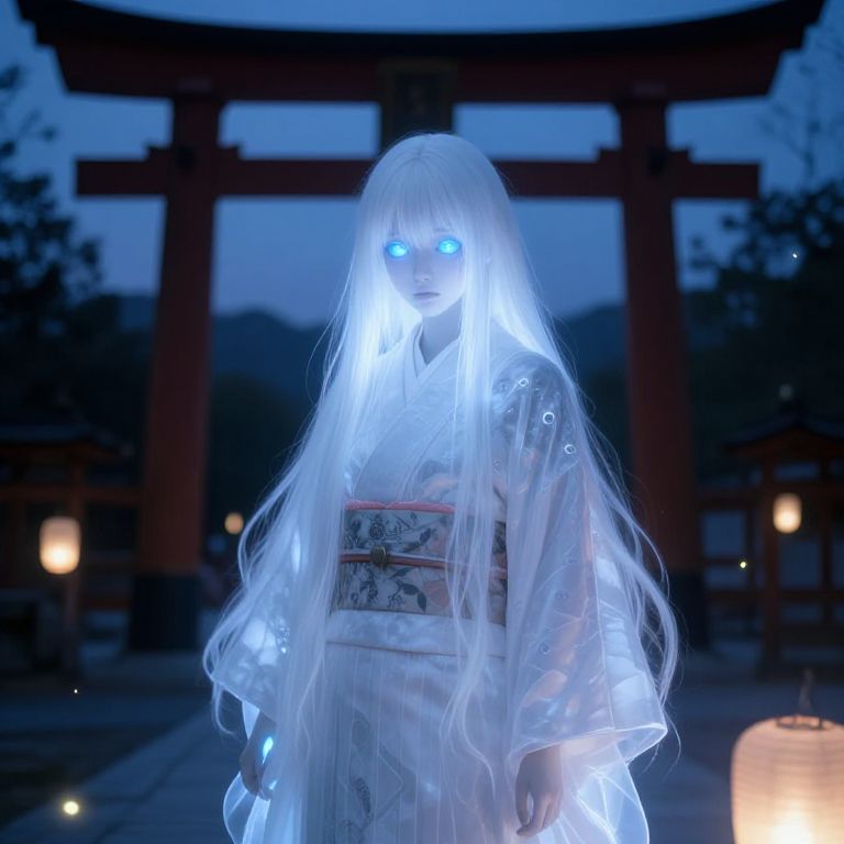 Photograph of a glowing blue-eyed, translucent figure in a white kimono, standing in front of a torii gate at night.