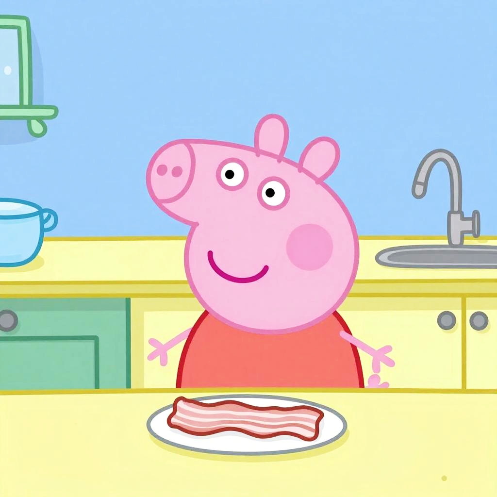 Illustration of Peppa Pig wondering if she ate bacon, cute cartoon style, pastel colors, Peppa sitting at a kitchen table with bacon on a plate, curious expression, children's book art