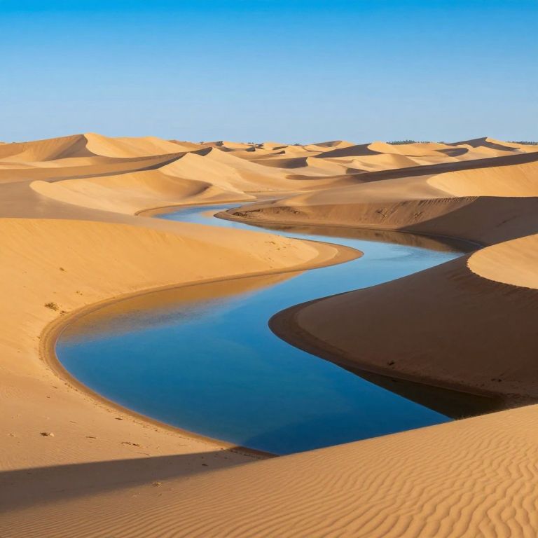 Photograph of a vast desert landscape with undulating sand dunes under a clear, bright blue sky. A winding, shallow river of deep blue water snakes through the golden, rippled sand, reflecting the sky. The dunes cast shadows, adding texture to the scene. The sun illuminates the sand, creating a warm, golden hue that contrasts with the cool blue of the water. The image captures the serene beauty of the desert environment with its smooth, flowing curves and stark, natural colors.