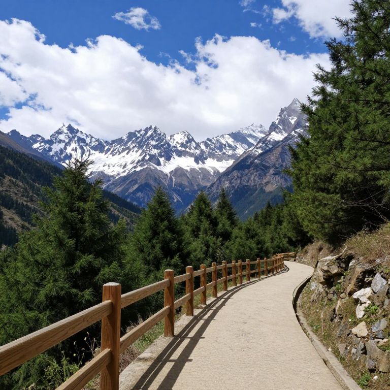 Photograph of a mountainous landscape with a wooden railing on a dirt path in the foreground. The path curves to the right, leading into a valley. Snow-capped mountains rise in the background under a bright blue sky with scattered white clouds. Dense green pine trees flank both sides of the path, creating a picturesque, serene scene.