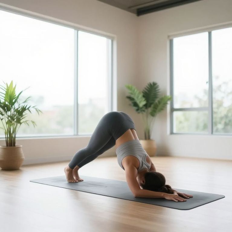 Leisure yoga in a modern studio with large windows letting in natural light, a person in comfortable clothing practicing yoga on a sleek mat, surrounded by minimalist decor and plants