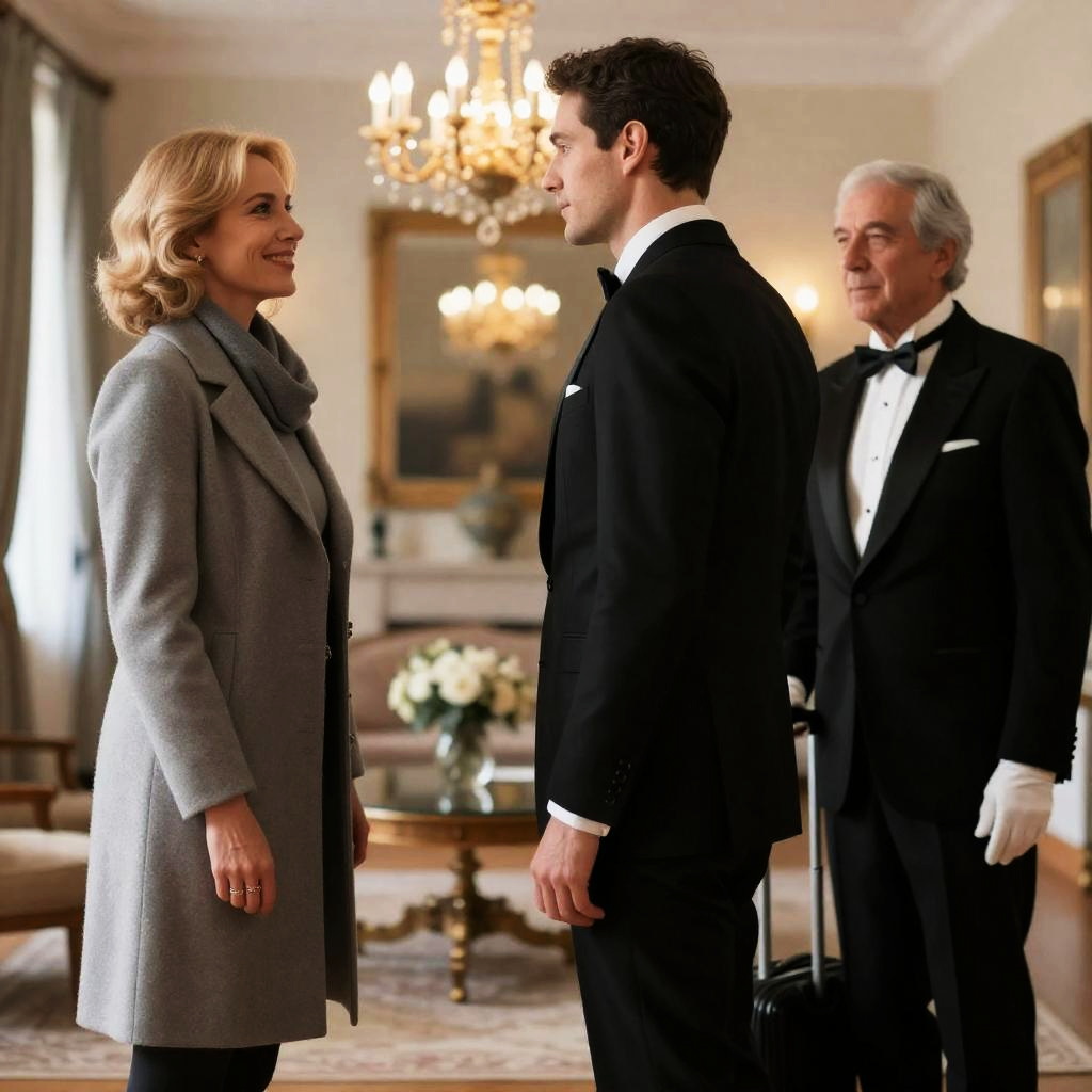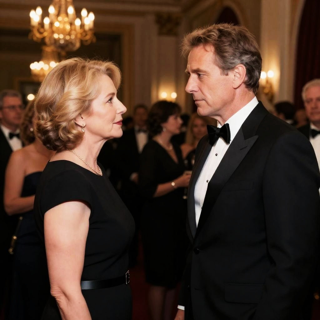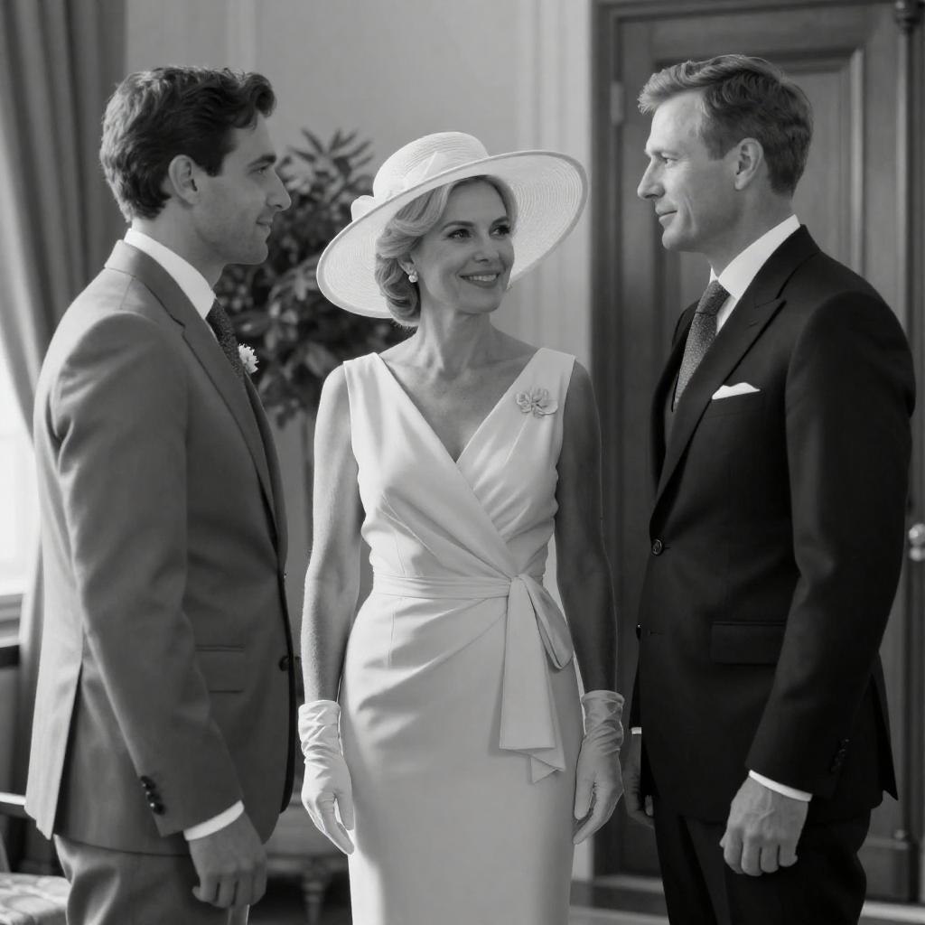 Photograph of a wedding reception. Three people in the foreground: middle-aged man in black tuxedo, older man in black tuxedo, woman in red blazer and white lace skirt holding white and pink bouquet. Woman has blonde updo, wearing pearl headband. Man on the left in black suit facing older man. Background: shelves with books and decorations, woman in black dress holding black purse. All three people smiling. Indoor setting with warm lighting.