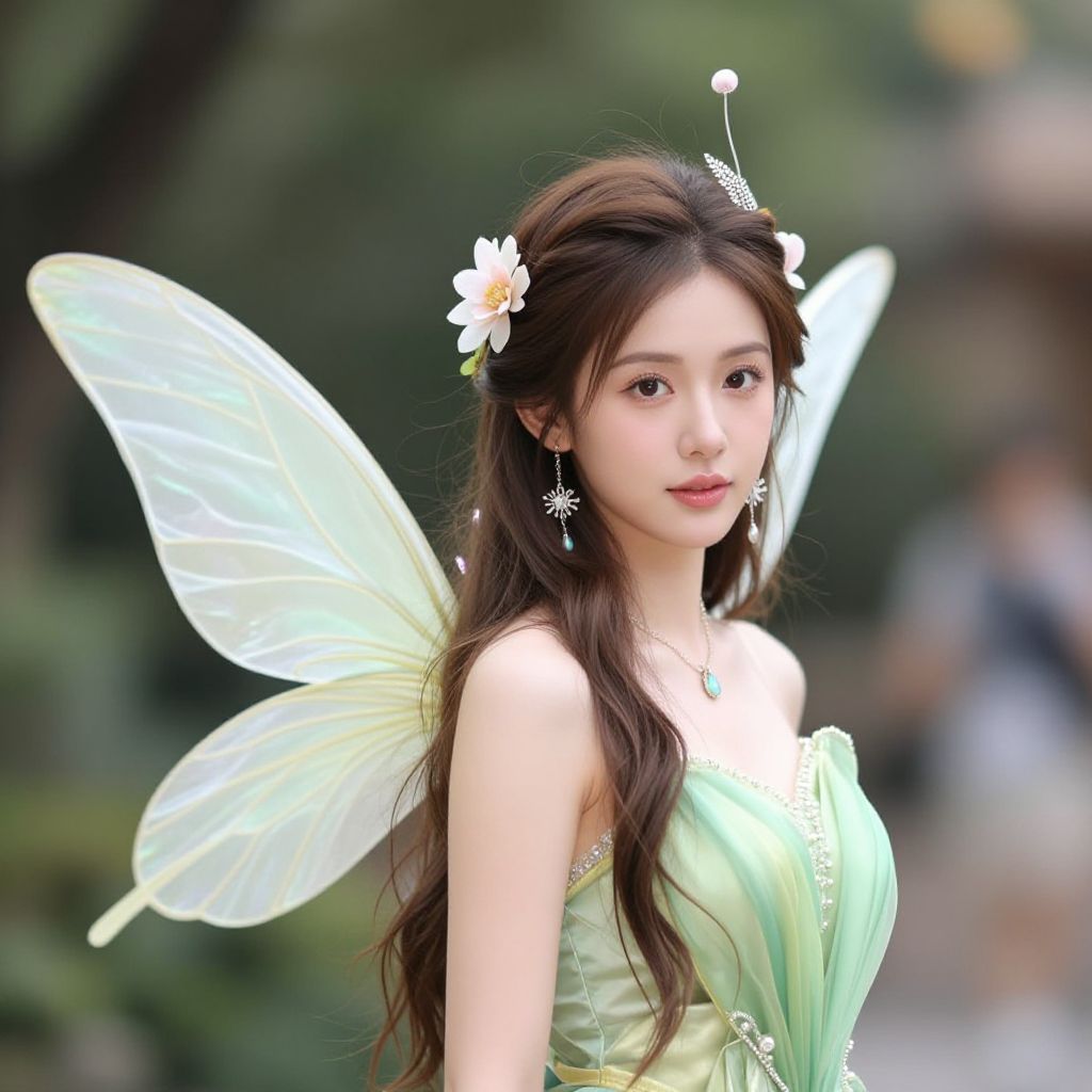 Photograph of an Asian woman with fair skin and long dark brown hair, adorned with a white flower on the left side. She wears a light green, strapless dress with delicate lace and a jeweled necklace. She has translucent, fairy-like wings with fine veins, and her expression is soft and slightly melancholic. The background is blurred greenery, suggesting an outdoor setting. The lighting is soft, highlighting her ethereal appearance. Her makeup is subtle, with pink lips and minimal eye makeup. The overall image conveys a whimsical, fairy-tale aesthetic.