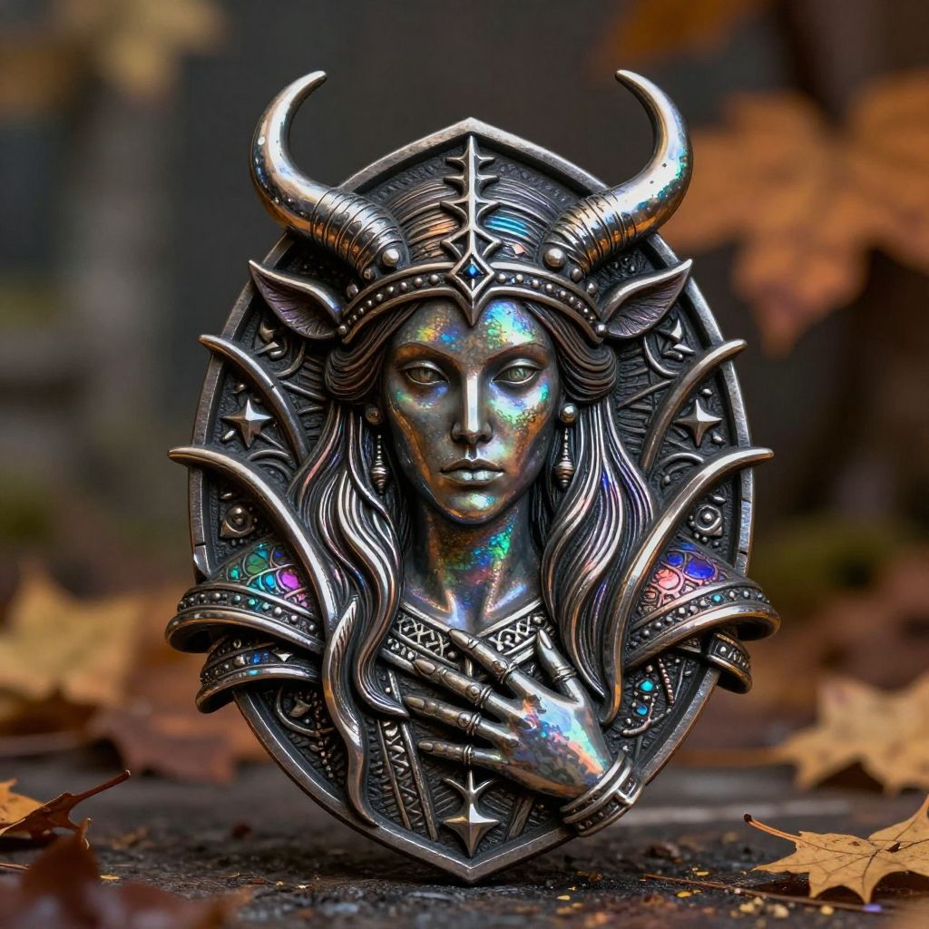 Metal trinket depicting a Kaervek, the Spiteful Regina Valluzzi, natural, shimmering, vibrant, gothic, rpg, 1400ad, ultra detailed, detailed, immersive, reminiscent of high fantasy RPG games, HD, masterpiece, best quality, hyper detailed, super realistic, perfect face, perfect hands, award-winning, professional, breathtaking, linquiveraautumnal Cragheated weatherpixel-art . low-res, blocky, pixel art style