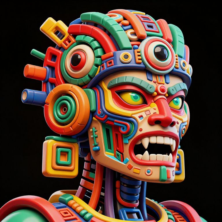 The image is a highly detailed 3D illustration of a cybernetic Mayan robot personified as a cross-section interior view of a visual cortex on DMT. The character exhibits a surreal, multi-dimensional appearance, reminiscent of the works of artists like Mark Ryden, Alex Grey, and Kenny Scharf. The character's face is sharp and menacing, with intense, multi-colored eyes that appear to be glowing. The mouth is wide open, revealing sharp, jagged teeth, and the nose is a prominent red feature. The character is adorned with intricate, geometric patterns and shapes, including a large, circular eye in the center of the head, surrounded by a series of smaller, circular elements. The overall color palette is vibrant and intense, with a mix of red, yellow, green, and blue hues. The character's body is composed of clean, geometric shapes, and the overall composition is dynamic and complex, with various elements interacting and overlapping in a visually striking manner. The image is a striking representation of a fusion of cybernetic and Mayan influences, with a strong emphasis on surrealism and intense visual impact.